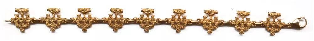 Dieses Armband wird in verschiedenen Legierungen und in 19cm bzw. 21cm Länge angefertigt. Bitte wählen Sie entsprechend aus. Das Armband besteht aus 9 oder 10 Kreuzen die jeweils eine Größe von 15mm haben. Die Glieder werden mit einer Öse miteinander verbunden. Den Verschluß bildet ein stabiler Karabiner. Diese Replik wird in unserer Goldschmiede, die schon in 6. Genaration besteht, gefertigt. Das Modell ist eine Nachbildung des gefundenen Goldschatzes. Nach der Musterherstellung wird das Modell in Wachs modelliert und in allen Gold- und Silber-legierungen gegossen. Danach wird das einzelne Stück von Hand verlötet und versäubert.