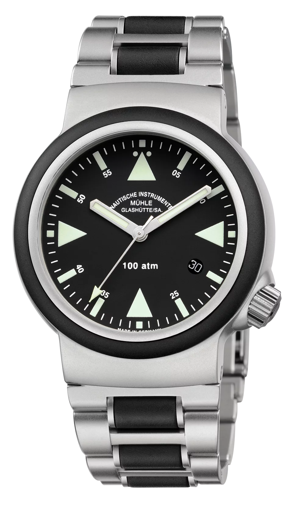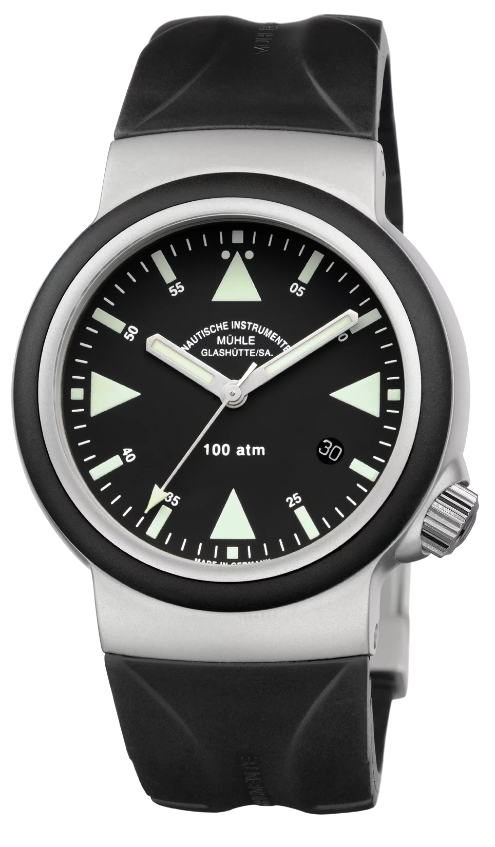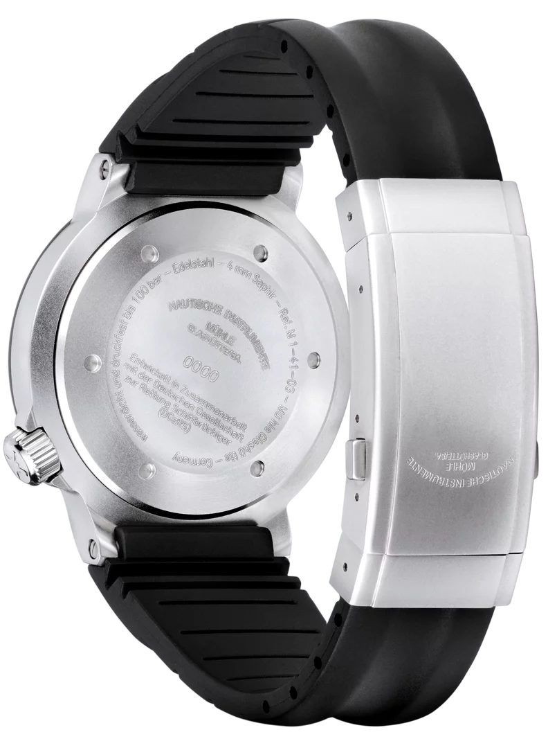 Movement: SW 200-1 Mühle Version, automatic, Mühle version with woodpecker neck regulation, own rotor, characteristic surface finishes, stop-second, fast date correction, 38-hr power reserve, Case: Stainless steel, Rubber bezel, 4 mm thick, sapphire crystal with internally ground loupe, Screwed case back, Screw-in crown, Water-resistant to 100 bars, strap: Rubber or stainless steel strap with extension and stainless steel safety clasp, Screwed strap attachment bridges Please select! Dimension: Ø 42.0 mm; H 13.5 mm Dial: Black, Super LumiNova hands and indices, intensely luminous
