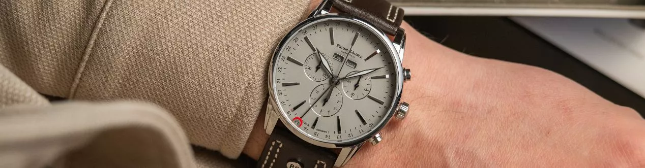 With the ATRIUM CHRONO LIMITED, the popular bestseller receives an update. Featuring a redesigned look, a new movement, and available in two case variations, the Atrium Chronograph will be available from May 2025. This timepiece shines with numerous complications including a chronograph function, a pointer date, and day and month displays. Limited to just 199 pieces per version, it embodies the highest craftsmanship and timeless sophistication. Each watch comes in a newly designed, high-quality case and is delivered with a hand-signed certificate of authenticity. Base movement: Ronda 5040.F Case: Stainless steel Caseback: Open caseback Clasp: Folding clasp Designation BS movement: Quartz movement in refined BS version Diameter: 42.5 mm Glass: Sapphire glass with anti-reflective coating inside Height: 11.5 mm Leather strap texture: smooth Lug: 22 mm Luminous hands: Yes Strap colour: dark brown Strap type: Calfskin strap Water resistance: 10 bar Weight: 100 g Garantie: 2 Jahre Lieferumfang: Uhr, Uhrenbox und Papiere Offizieller Konzessionär