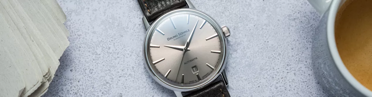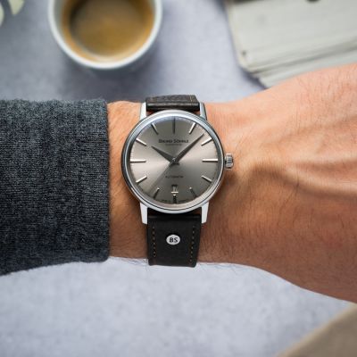 The gray sunburst dial is minimalist yet sophisticated. Twelve polished applied indices provide depth, while the date window at 6 o’clock ensures functionality. A mocha-colored bio-leather strap completes the look with understated style.