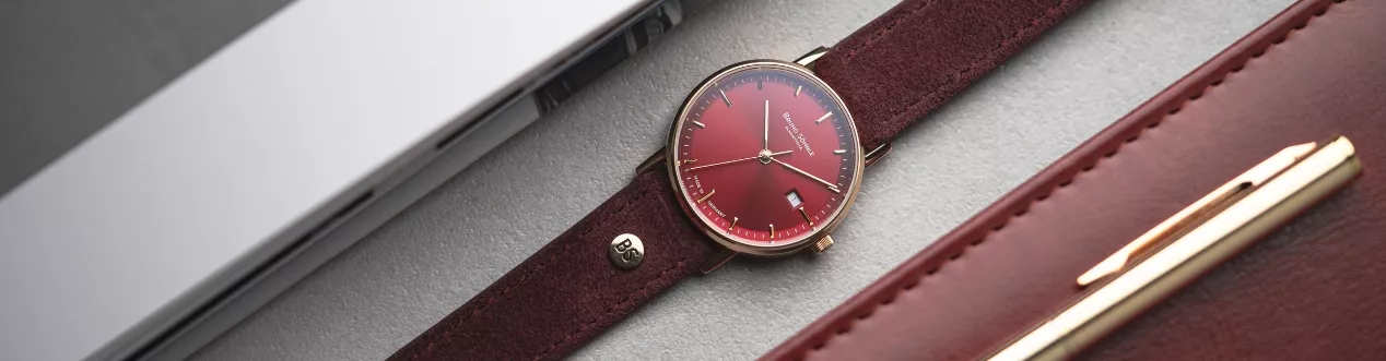 Quartz movement in refined Bruno Söhnle version (Base movement Ronda 785), Stainless steel IP gold, Ø 30 mm, Height 6.5 mm, 3 bar, Sapphire glass with anti-reflective coating inside, Suede strap Bordeaux, Pin buckle