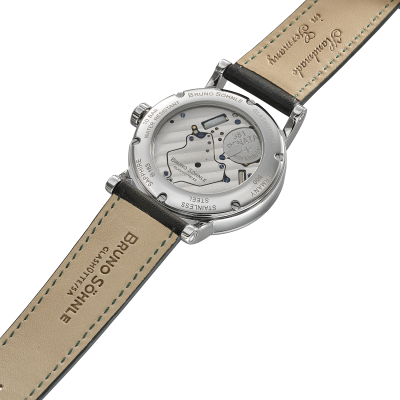 The movement of the Pesaro IV is based on the Swiss Ronda 7003.L in a refined Bruno Söhnle version and consists entirely of revisable brass parts. The movement features an in house polished cover plate that has a high level of refinement.