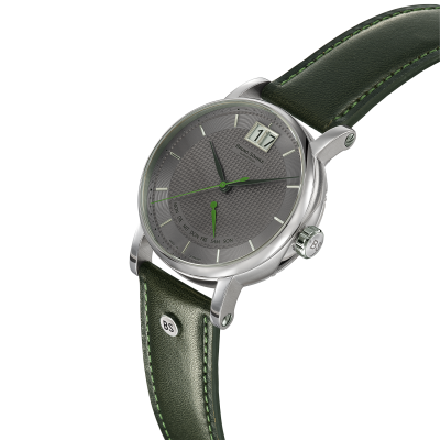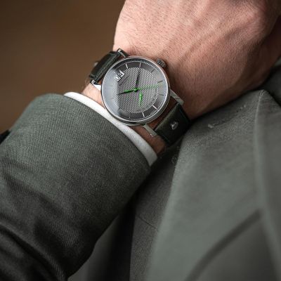 The gray dial version, on the other hand, exudes a certain mystique. The smoky, deep gray color scheme gives the watch a striking look. Together with the black hands, silver indices and green color accents, it creates an expressive aesthetic that puts the wrist of any wearer in the spotlight.